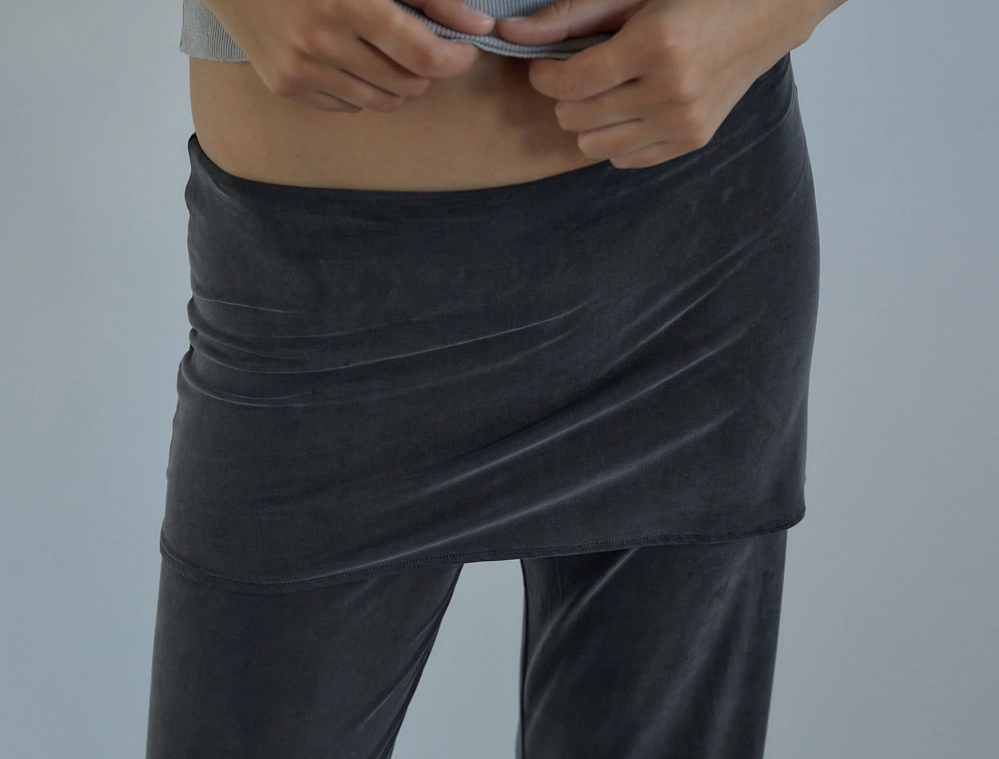 Low-waisted cupro pants with a built-in mini skirt detail (non-removable).