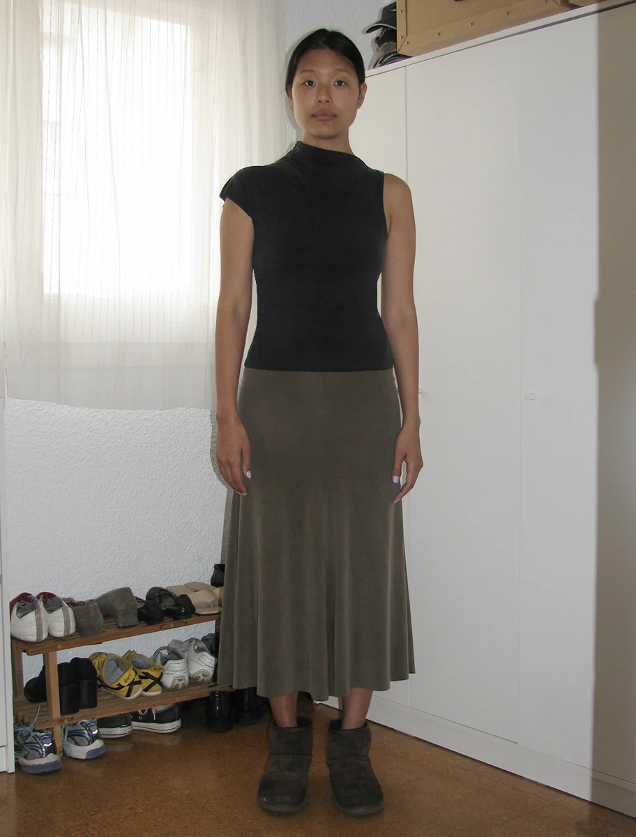Double layer, asymmetric sleeve, soft-neck cupro top with laser-cut edges.