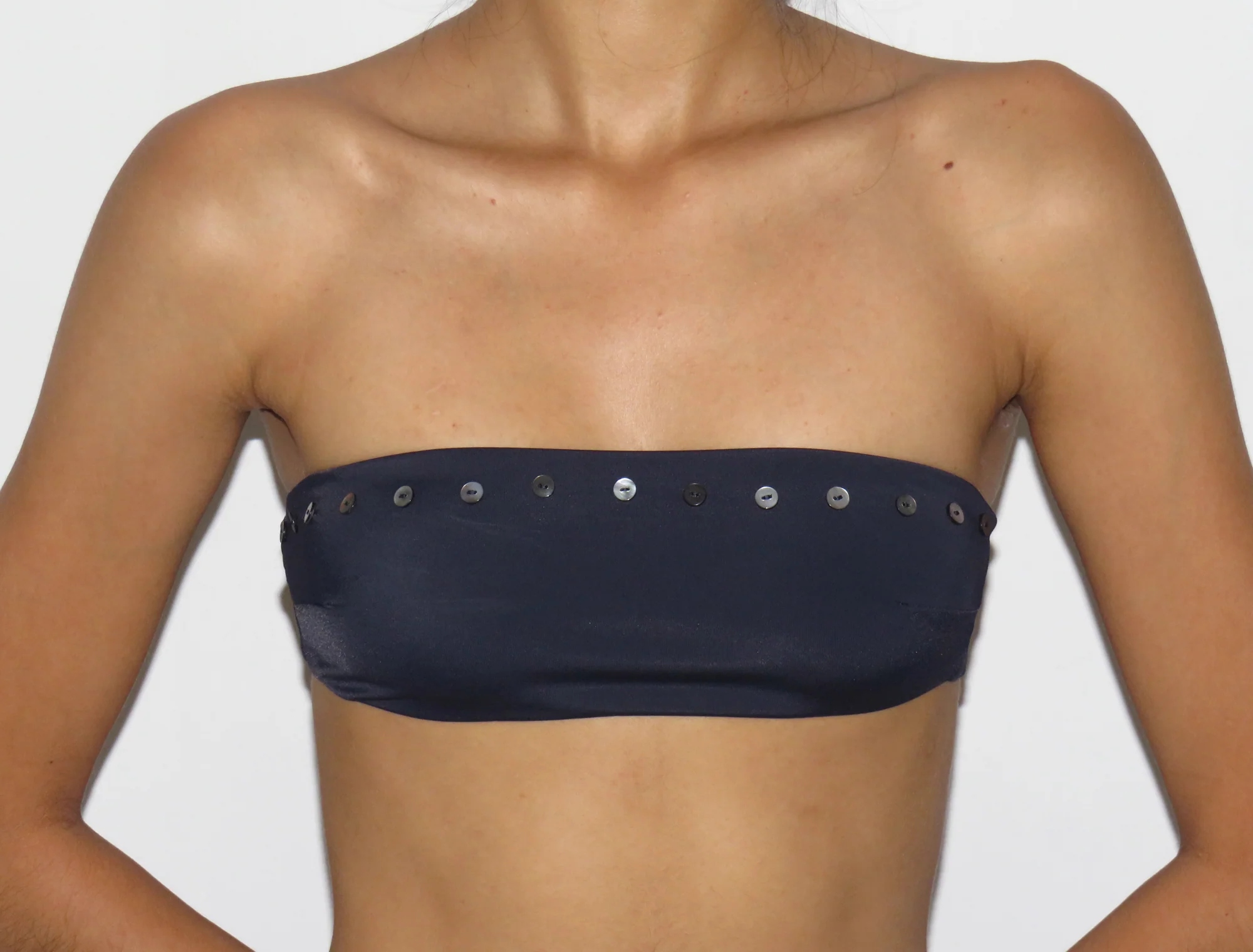 Bandeau bikini top with mother-of-pearl buttons on the front.