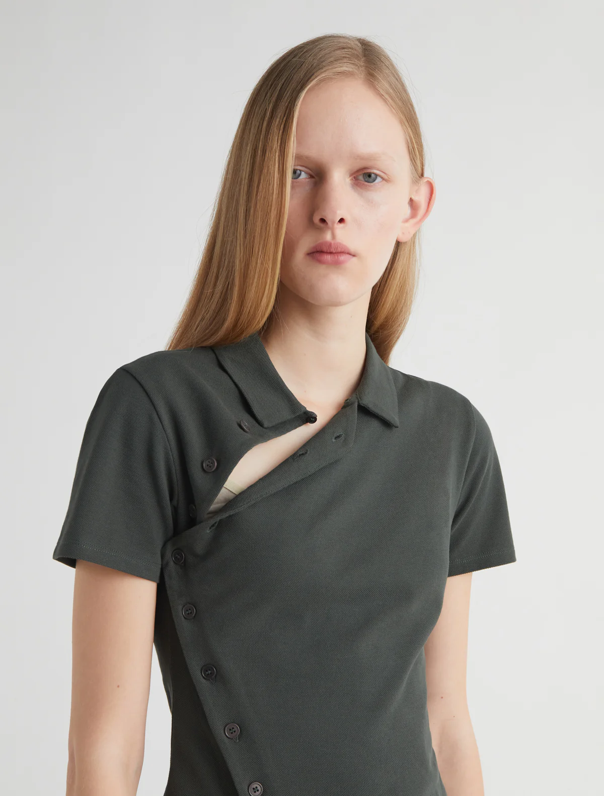Short-sleeved, asymmetric buttoned top. Made from piqué polo fabric.